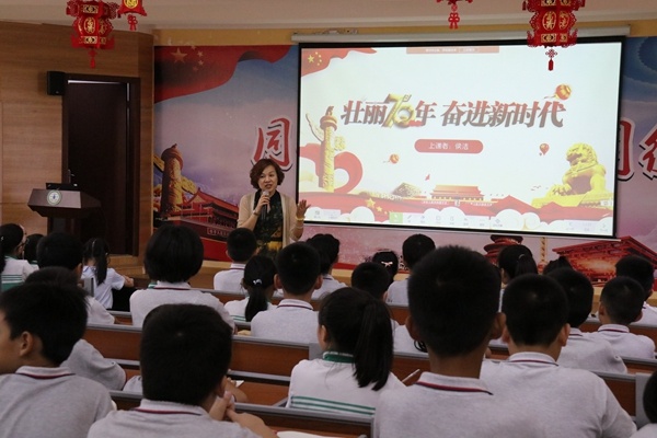 “沒(méi)有先輩們的努力,哪有我們今天的生活?我們從一個(gè)弱國(guó),到如今的強(qiáng)國(guó),幾十年的風(fēng)雨,每個(gè)坎都足以讓人刻骨銘心。”9月27日上午,在中山市西區(qū)鐵城小學(xué)報(bào)告廳里,學(xué)校校長(zhǎng)侯潔正在給孩子們上思政課。
