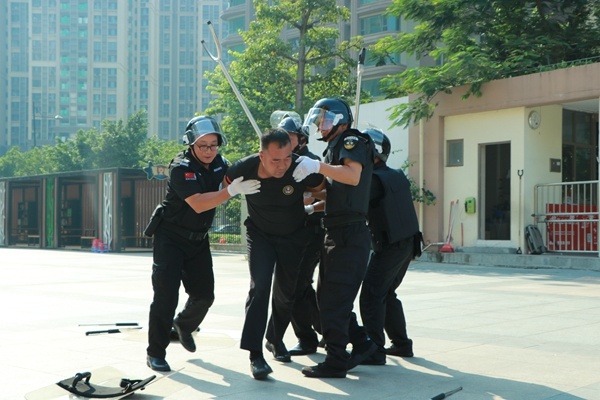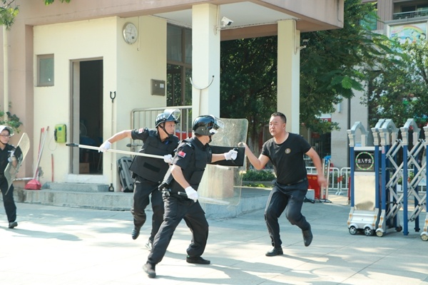 9月24日大課間,全體師生準(zhǔn)備集隊前往操場,一名“暴恐分子”(扮演)手持長刀沖進校園,學(xué)校保安看到此景后,立即吹響哨子,迅速拿起盾牌、大頭棒等器械沖出來,齊心協(xié)力將其制服。演練過程中,保安人員反應(yīng)迅速、配合默契,采取處置措施及時、合理,表現(xiàn)出良好的處突能力。