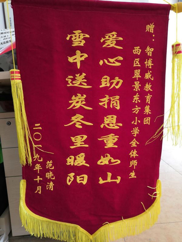 11月5日上午,翠景東方小學(xué)收到一面寫著“愛心助捐恩重如山 雪中送炭冬里暖陽(yáng)”的錦旗和一封感謝信。東升鎮(zhèn)華盛學(xué)校六年級(jí)和三年級(jí)的學(xué)生范雪、范峻博的家長(zhǎng)送來(lái)的,以表示他們對(duì)翠小全體師生的感激之情。