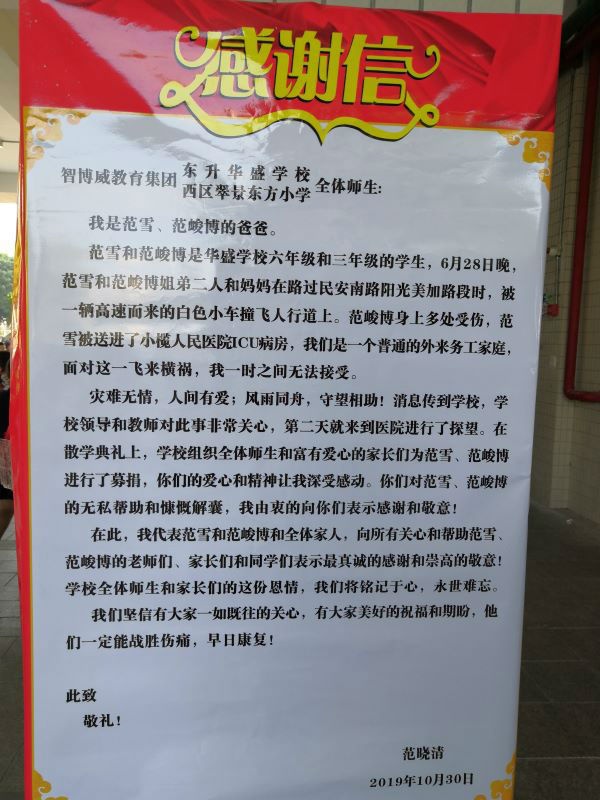 據(jù)悉,6月28日晚,范雪和范峻博姐弟二人和媽媽在路過(guò)民安南路陽(yáng)光美加路段時(shí),被一輛高速而來(lái)的白色小車撞飛人行道上。范峻博身上多處受傷,范雪被送進(jìn)了小欖人民醫(yī)院ICU病房,做為一個(gè)普通的外來(lái)務(wù)工家庭,面對(duì)這一飛來(lái)橫禍,家長(zhǎng)一時(shí)之間無(wú)法接受,更無(wú)經(jīng)濟(jì)能力給孩子們醫(yī)治。但是災(zāi)難無(wú)情,人間有愛;風(fēng)雨同舟,守望相助!消息傳到翠景東方小學(xué)后,學(xué)校領(lǐng)導(dǎo)和全體教師對(duì)此事非常關(guān)心,第二天就委派代表去到醫(yī)院對(duì)兩個(gè)孩子進(jìn)行了探望,并利用散學(xué)典禮組織全體師生和富有愛心的家長(zhǎng)為兩個(gè)孩子進(jìn)行了募捐活動(dòng),解決了他們的燃眉之急。范同學(xué)的家長(zhǎng)被翠小師生及家長(zhǎng)們的深情所感動(dòng),在孩子的病情穩(wěn)定之時(shí),特意抽出時(shí)間準(zhǔn)備了錦旗和感謝信向翠小全體師生表示感謝。