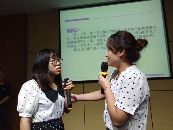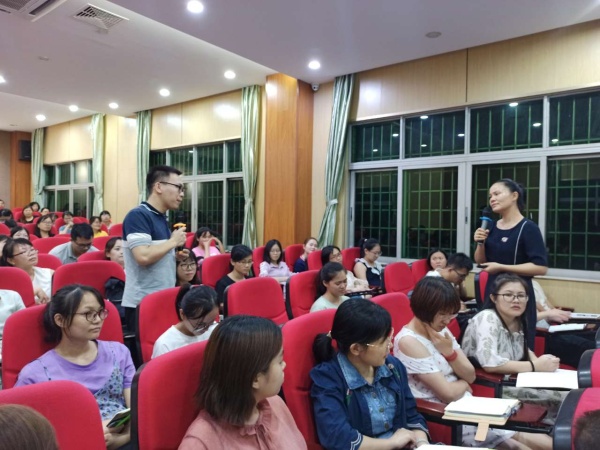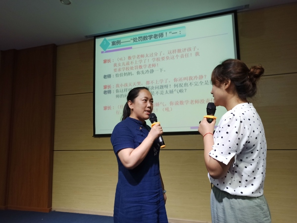 通過學(xué)生與老師、家長與老師的案例演練,老師們了解到溝通的技巧。理論與實踐相結(jié)合的模擬場面讓現(xiàn)場氣氛推上高潮。老師們積極參與,與彭老師傾情互動,精彩表演溝通中的片段故事,現(xiàn)場笑聲不斷,其樂融融。于詼諧幽默中傳授溝通的藝術(shù),在輕松愉悅中提高自己的素養(yǎng)。 其中,在案例二“當(dāng)家長與老師發(fā)生沖突時,班主任應(yīng)該怎么做?”中,路海云校長將自己的親身經(jīng)歷帶進(jìn)本次培訓(xùn),讓老師們明白,處理任何糾紛,學(xué)會傾聽,堅持底線,積極溝通,更容易達(dá)成一致。