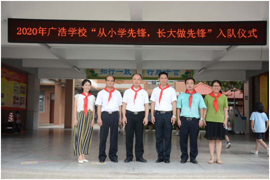 隊旗飄飄,星星火炬閃耀,為慶?!傲弧眱和?jié),2020年5月29日早上,中山市廣浩學校少先大隊部組織一年級學生舉行隆重的“從小學先鋒,長大做先鋒”主題入隊儀式。廣浩學校黨支部書記楊善德、少工委主任黃飛躍、德育處許向陽主任、梁超勝主任、團委莫欣老師、少先大隊輔導員陳燕坪老師出席了入隊儀式。
