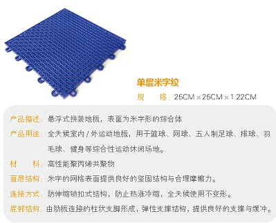 與硬質(zhì)地面相比,拼裝地板具有良好的安全性、減震性和反彈力,很好地實現(xiàn)垂直吸震及能量回送,側(cè)向緩沖,防滑,防運(yùn)動損傷,有效保護(hù)運(yùn)動者的運(yùn)動安全,充分發(fā)揮人體運(yùn)動潛能。采用原料聚丙?。≒P)為高強(qiáng)度材料,無毒環(huán)保。