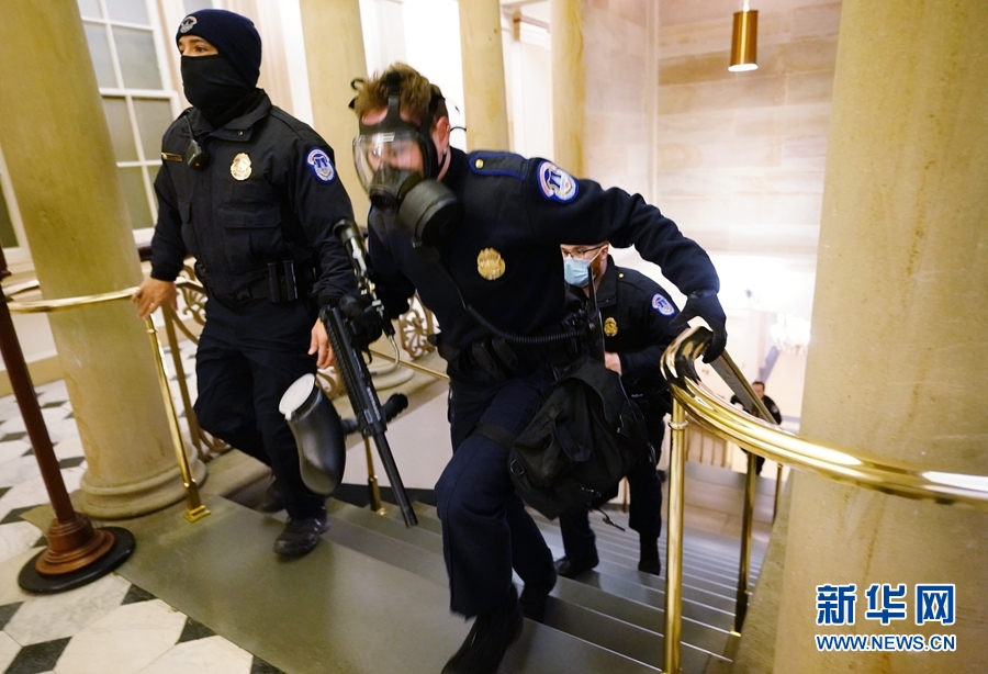 這是1月6日在美國華盛頓拍攝的國會警察緊急應(yīng)對闖入國會的抗議者的資料照片。新華社發(fā)(Pool圖片,凱文·迪奇 攝)
