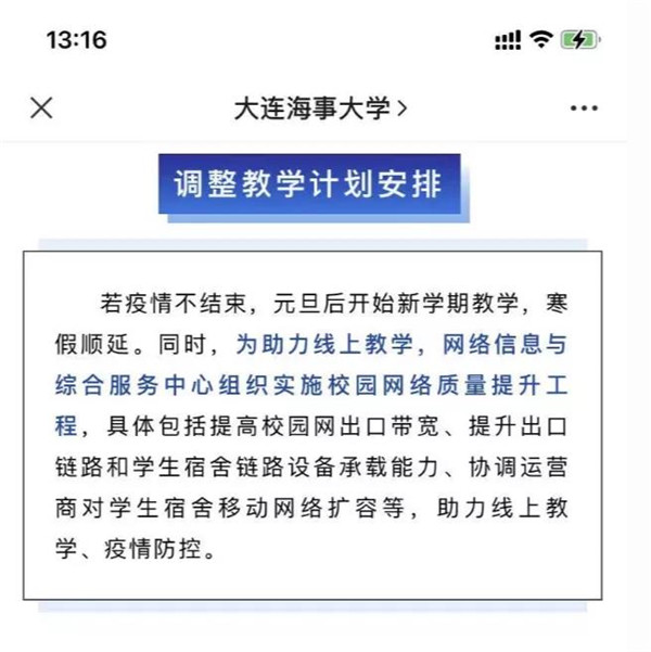 大連海事大學(xué)公眾號(hào)于2020年12月26日發(fā)布“致全校師生的一封信”稱,目前全體師生的核酸檢測(cè)結(jié)果均為陰性,至1月4日,若疫情還未結(jié)束,學(xué)校將開啟新學(xué)期教學(xué)安排,寒假向后順延。