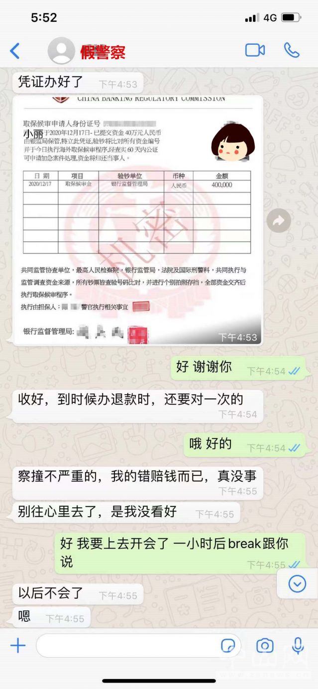2020年12月,小麗收到國(guó)外某社交軟件的“民警”好友申請(qǐng),小麗通過(guò)后,對(duì)方向小麗發(fā)送了“警察證”及“中國(guó)北京銀行監(jiān)督管理局CBRC”國(guó)際刑警調(diào)查科的電子文書(shū),聲稱(chēng)小麗涉嫌洗黑錢(qián),且“北京檢察院”已出具了執(zhí)行令,要求小麗將100萬(wàn)元轉(zhuǎn)到“安全賬戶(hù)”,否則大使館將其遣返回國(guó)接受法律制裁。社會(huì)經(jīng)驗(yàn)薄弱的小麗因?yàn)閷?duì)方提供的相關(guān)“證件”而深信不疑。