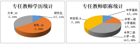 | 師資力量 | 全校老師共29人,研究生3人,本科16人,大專10人;其中高級職稱老師4人,中級職稱3人,初級職稱14人,8人未定級。