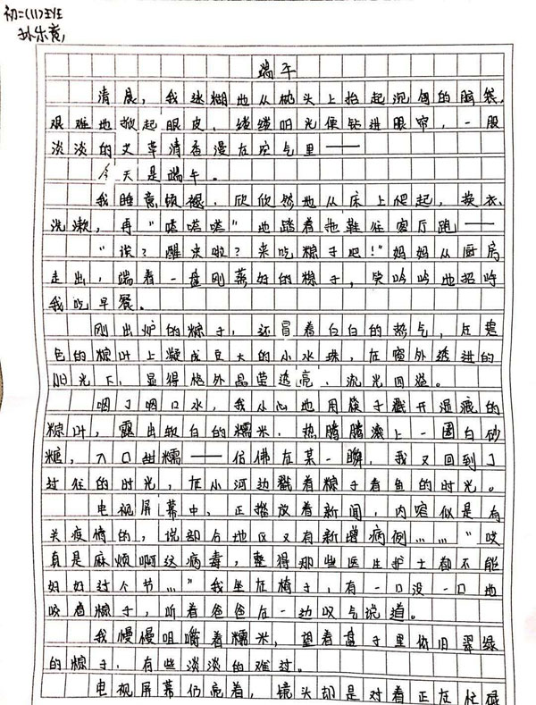 這次端午節(jié)主題活動(dòng)內(nèi)容有:1、“粽子情,我們傳”。要求初一級(jí)學(xué)生在2020年6月25-27(端午假期)在家里包一次粽子、制作香囊、掛艾草。2、“傳經(jīng)典,誦祖國(guó)”。要求初二級(jí)學(xué)生以端午節(jié)為主題,朗誦一首詩(shī)歌(視頻拍攝)、寫(xiě)一篇抒情文章、書(shū)寫(xiě)一幅對(duì)聯(lián)。初一、初二級(jí)各班都積極開(kāi)展了“端午主題”活動(dòng),讓學(xué)生感悟傳統(tǒng)文化的魅力,接受中華悠久文明的洗禮和傳統(tǒng)美德的熏陶,增強(qiáng)民族自豪感,用中華傳統(tǒng)節(jié)日引領(lǐng)同學(xué)們?cè)娨獬砷L(zhǎng)。