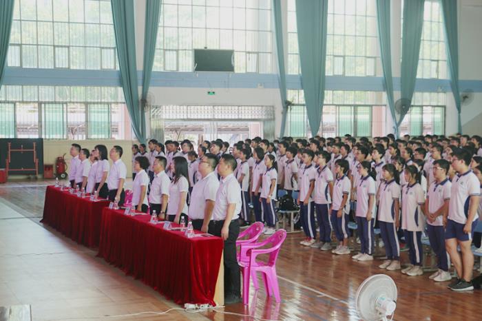 伴隨著雄壯的國歌聲響起,九年級畢業(yè)典禮拉開了序幕。全體起立,奏唱國歌。