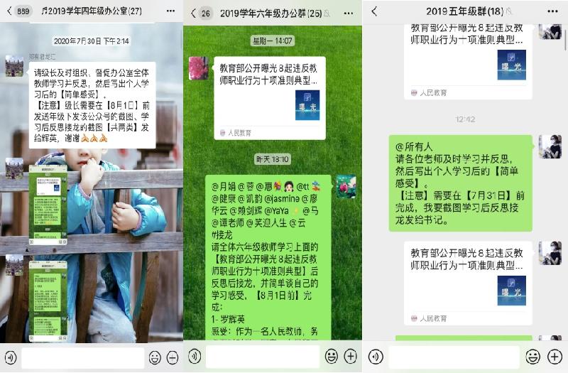 “師者,以德為先”。高尚的師德師風是教師從事教育工作的靈魂。為了進一步加強教師隊伍建設,不斷提高教師職業(yè)道德素質(zhì)和師德修養(yǎng),保障全體教師在良好師德師風塑造和學習中的不松懈和持續(xù)性,7月27日-30日,在暑假期間,龍江城區(qū)中心小學組織全體教師在線上重點學習了“教育部公開曝光8起違反教師職業(yè)行為十項準則典型問題”一文,并進行了自我反思和學習心得的分享交流。