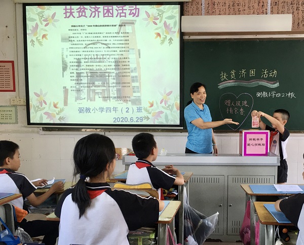 2020年6月28日,弼教小學(xué)大隊(duì)輔導(dǎo)員張敏靈在校園廣播及微信公號(hào)向全校師生發(fā)出倡議:伸出您的援助之手,奉獻(xiàn)您的一份愛心,送上您的一份真情,貢獻(xiàn)您的一份力量,點(diǎn)燃貧困家庭的一份希望,讓那些在困難中的人們感受到溫暖,得到幫助,早日擺脫困境,過上幸福的生活。倡議發(fā)出后,弼教小學(xué)師生踴躍參與,奉獻(xiàn)愛心。