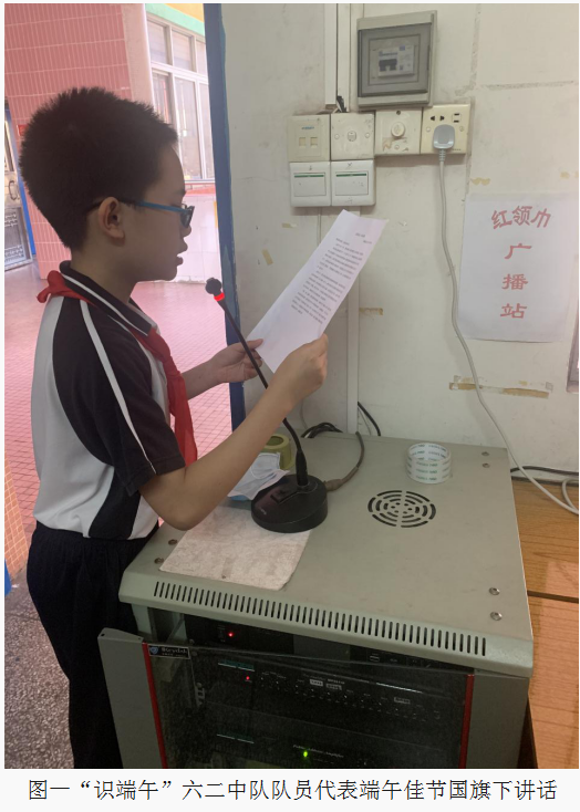 周一升旗儀式中,六二中隊隊員代表進(jìn)行了關(guān)于傳統(tǒng)文化端午佳節(jié)的國旗下講話。本次講話主題鮮明,不僅讓廣大少先隊員深入了解和感受了中華傳統(tǒng)節(jié)日文化的博大精深,提高了隊員們學(xué)習(xí)傳統(tǒng)文化的意識,增強了民族自豪感,激發(fā)了他們的愛國主義熱情。