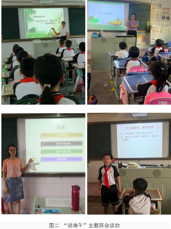 各中隊以“我們的節(jié)日?端午節(jié)”為主題開展隊活動課。在輔導(dǎo)員老師的指導(dǎo)下,各中隊精心準(zhǔn)備,從端午的起源、習(xí)俗、諺語、民俗故事暢談了對端午的認(rèn)識,通過誦讀屈原的經(jīng)典名句,感受到了端午節(jié)的文化內(nèi)涵,體驗了我國傳統(tǒng)節(jié)日的獨特魅力。