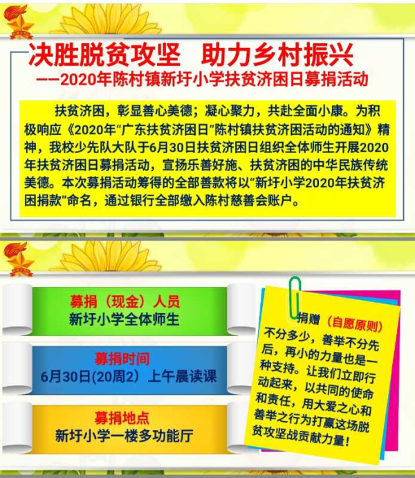 愛心傳遞,情暖校園,眾人拾柴火焰高,愛心奉獻(xiàn)暖人心。2020年6月30日早上,在新圩小學(xué)多功能室舉行以“決勝脫貧攻堅(jiān),助力鄉(xiāng)村振興”為主題的“2020年新圩小學(xué)扶貧濟(jì)困日”募捐活動(dòng)。此活動(dòng)在新圩小學(xué)大隊(duì)部的倡議下,得到全體師生的積極參與,愛心捐助,奉獻(xiàn)一份愛心,給予一份微薄之力,同心助力鄉(xiāng)村建設(shè)與發(fā)展。