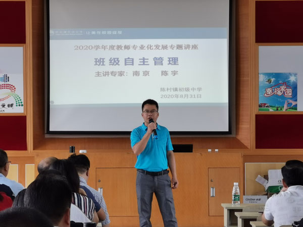 暑去秋來,學期伊始;使命催征,時不我待。為進一步貫徹2020年陳村鎮(zhèn)教育高質(zhì)量發(fā)展座談會的精神,同時為了培養(yǎng)教師的德育素養(yǎng),獲取多元化的教育途徑,了解德育新動態(tài),全面提升教師的育德水平和創(chuàng)新能力,打造一流的師資隊伍,2020年8月31日陳村鎮(zhèn)初級中學邀請南京市第二十七高級中學陳宇老師為全校教師做了題為“讓學生成為班級管理真正的主人――班主任引導下的學生自主管理”的培訓講座。