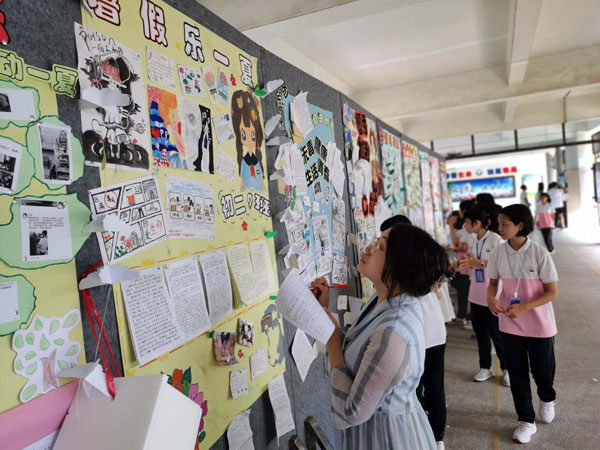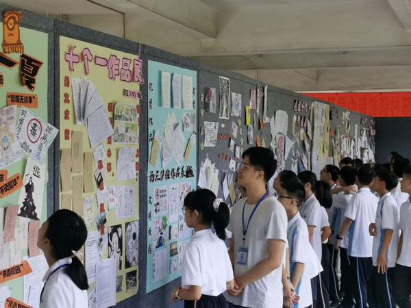 本次暑假 “十個一”作品展示活動項(xiàng)目有:1、“書信立志 不負(fù)韶華”。2、“小小發(fā)明家”。3、“愛祖國,誦經(jīng)典”――中華傳統(tǒng)文化經(jīng)典誦讀。4、“疫情當(dāng)下――我可以做的是 ”征文活動。5、“勞動一夏”。6、“走出校園,體驗(yàn)社會”實(shí)踐調(diào)查。7、“禁毒無小事,常掛心上記”漫畫作品。8、“印象陳村”明信片制作。記錄陳村鎮(zhèn)情,感受陳村發(fā)展。9、“陳村色彩”主題攝影。10、讀一本好書,創(chuàng)書香校園。本次暑假“十個一”活動形式多樣,內(nèi)容豐富,給同學(xué)們提供了一個鍛煉與展示的平臺,得到了同學(xué)們的積極響應(yīng)。課間期間,初一、初二級的同學(xué)們有序地參觀了暑假“十個一”作品展覽。濃墨重彩的書畫作品,心靈手巧的手工佳作,精心排版的板報(bào),讓同學(xué)們大開眼界,情不自禁地發(fā)出陣陣贊嘆。每年的暑假“十個一”作品,同學(xué)們都能夠別出心裁,充分發(fā)揮豐富的想象力和創(chuàng)造力,用心血凝聚成勞動的成果。