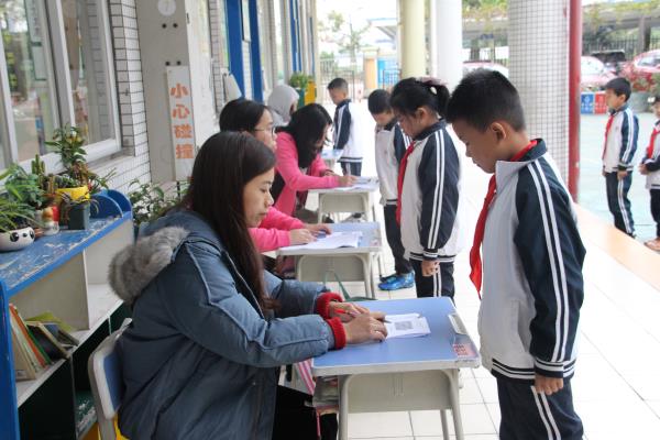 第二部分的考核在十六周一下午進行,語數(shù)英三科同時考核。三至六年級的考核形式是三科綜合筆試,一、二年級則是通過各科組的評委老師到各班進行現(xiàn)場口語考查。寒意驟至,考核活動卻是如火如荼地進行著,三至六年級的學生們端坐在教室里奮筆疾書,一、二年級的小朋友們則在所有考核老師的組織下,有的在課室認真聆聽故事;有的在老師指揮下排著整體的隊伍;有的在不同學科的老師面前奶聲奶氣地回答著各科的問題。稚態(tài)可掬的口述,還不忘禮貌地問好,配上那可愛的笑容,又是“素養(yǎng)”的另一道風景。