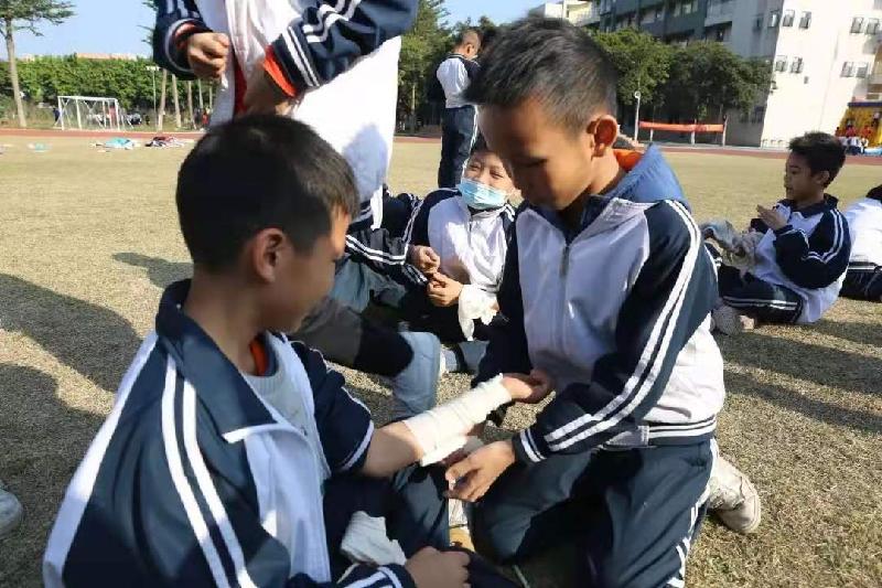 止血包扎是基本的技巧。在教練的指導(dǎo)下,同學(xué)們都學(xué)會(huì)了簡單的包扎止血技術(shù)。