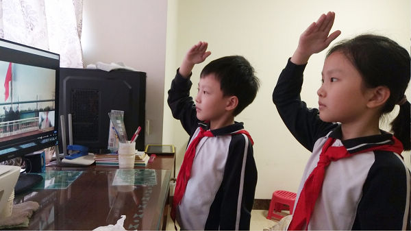 伴隨著雄渾激昂的國(guó)歌,鮮艷的五星紅旗在羅沙校園冉冉升起。升旗臺(tái)前,老師們衣著端莊,隊(duì)列整齊;電腦、手機(jī)屏幕前,師生、家長(zhǎng)們神情莊嚴(yán)肅穆,行禮,全體同時(shí)齊唱國(guó)歌。