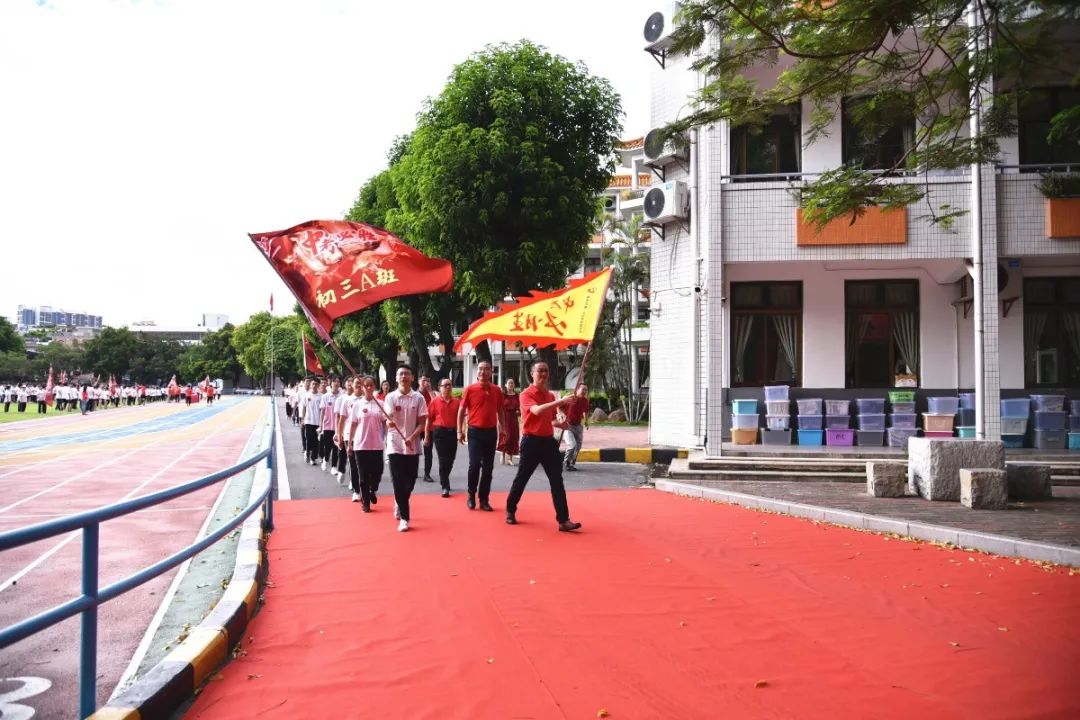 隨后,曾校長為初三級管理團(tuán)隊授予“中考必勝旗”。與此同時,綠茵場上的各班旗手也舞動手中的“中考必勝旗”交相互動,預(yù)示著我校今年中考長風(fēng)破浪,旗開得勝!