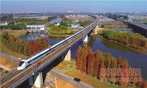 在河涌?jī)膳越瘘S色的水杉樹映襯下,一列高鐵恍如進(jìn)入黃金大道。