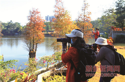 游客和攝影愛好者在仙泉酒店對(duì)開湖邊拍攝與欣賞水杉美景。