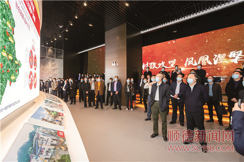 與會人員正在順德區(qū)踐行新發(fā)展理念交流中心內(nèi)觀看村級工業(yè)園改造規(guī)劃展板。/珠江商報記者林安迪攝