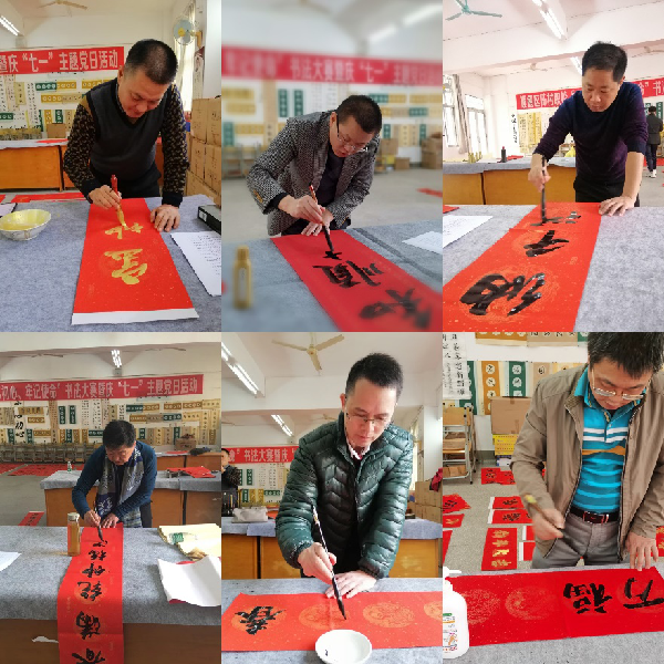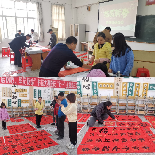 本次活動邀請了韓雨龍、鐘全榮、李華、王海平、鄧富華、劉建華等具有書法特長的黨員教師揮毫潑墨、送福迎新。工會委員提前精心準備了對仗工整、精煉喜慶的春聯(lián)集錦,供全校教職工選擇。
