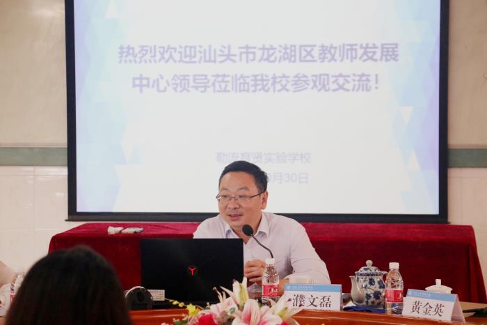 參觀完校園后,在二樓會議室開展座談會,會議由吳海堅副主任主持。會上,濮文磊校長對汕頭市龍湖區(qū)教師發(fā)展中心領(lǐng)導專家一行的來訪表示熱烈的歡迎。與會人員一同觀看了學校宣傳片,使他們對學校文化建設(shè)有更深的了解。濮文磊校長對學校的發(fā)展歷程、辦學理念、辦學特色以及學校一體化發(fā)展作了簡要的匯報。