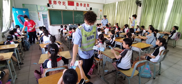 向同學(xué)們派發(fā)安全知識(shí)宣傳單張