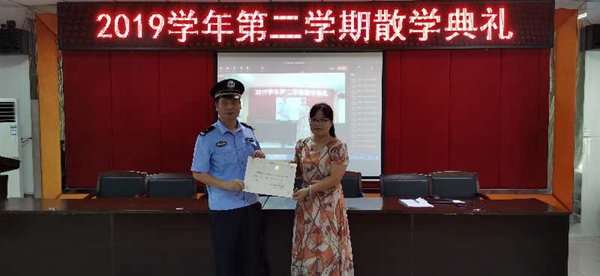 廖校長(zhǎng)為駐校法制黎日良校長(zhǎng)頒發(fā)證書(shū)