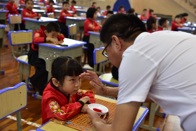 在古代,學(xué)童入學(xué)讀書前,都會有啟蒙師長用紅色的朱砂在學(xué)子們的額頭正中點(diǎn)上紅痣,稱為“開天眼”?!梆搿蓖ā爸恰?,意為開啟智慧,以此寄托美好的愿望,從此眼明心亮,好讀書、讀好書、讀書好。夏校長、學(xué)校領(lǐng)導(dǎo)、班主任、科任老師到學(xué)生場地為新生點(diǎn)智。
