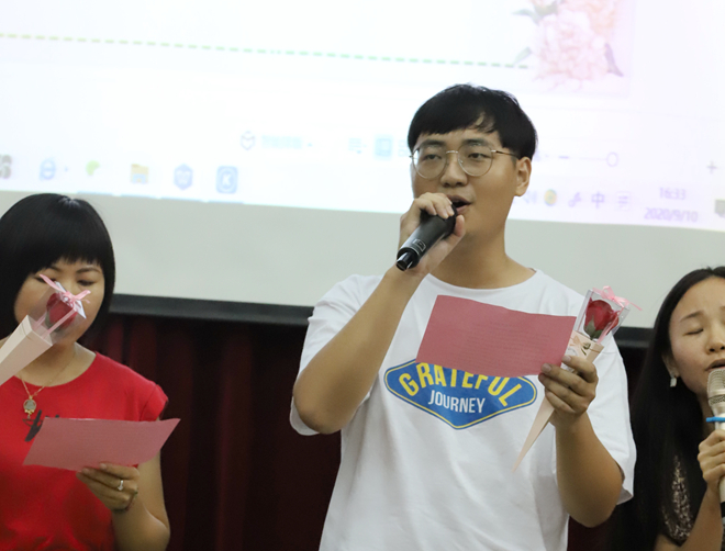 9月10日下午,全體教師聚集學(xué)校階梯式,進(jìn)行了短暫的慶祝教師節(jié)活動。簡單的下午茶,臨時(shí)排練的小節(jié)目,讓現(xiàn)場到處都洋溢著幸福、快樂的節(jié)日氣息!