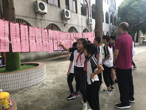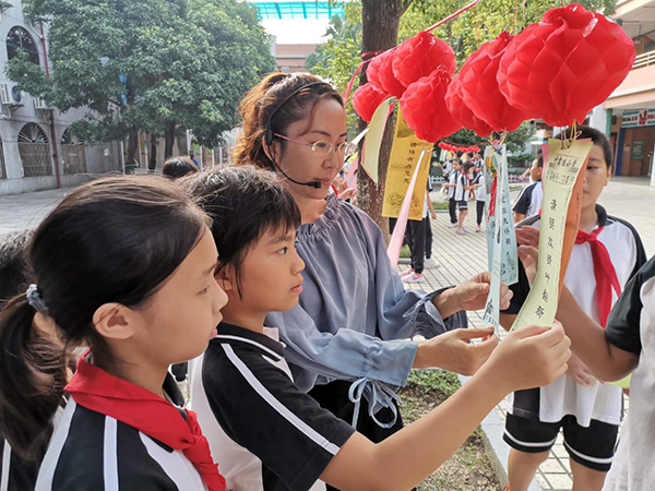 是日,秋高氣爽,紅燈籠系著謎條,在秋風(fēng)中飛舞。孩子們快樂地穿行在謎條間,或沉思,或討論,或駐足仰望……絡(luò)繹不絕。猜中了,取下謎條,興沖沖地走到兌獎區(qū),換來一顆顆甜甜的糖果。猜不中,也不泄氣,繼續(xù)思考……燈謎協(xié)會到譚沃宏老師和葉汝泉老師也一同前來,跟我們到小謎友互動,他們上那么耐心地講解,孩子們仰著腦袋,認(rèn)真聆聽著……