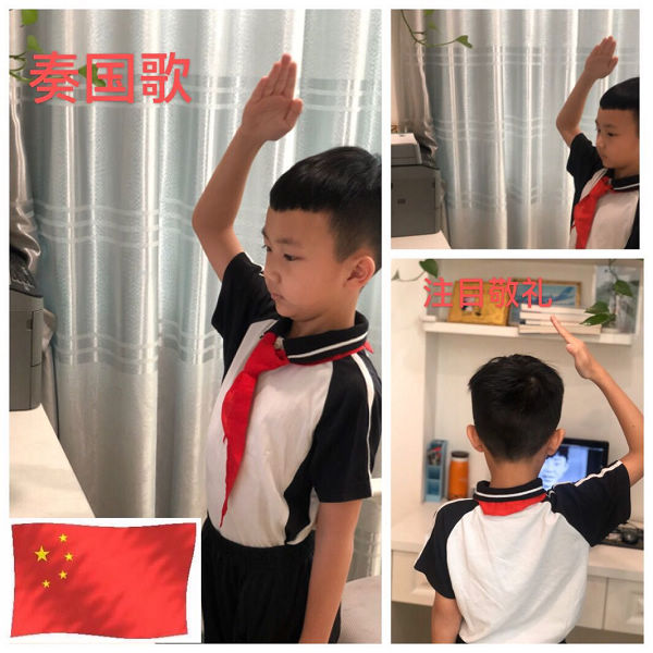 “升國(guó)旗、奏唱國(guó)歌,敬禮”,鮮艷的五星紅旗冉冉升起,奮發(fā)的少先隊(duì)員們敬著標(biāo)準(zhǔn)的隊(duì)禮,鏗鏘的國(guó)歌奏響在全校師生家里,滾燙的愛(ài)國(guó)之情在每一位心中升騰.......這一刻,我們雖身處不同地方,但我們都懷揣著一顆熾熱的赤子之心,共同祈愿能早日回歸等待了我們?cè)S久的校園!