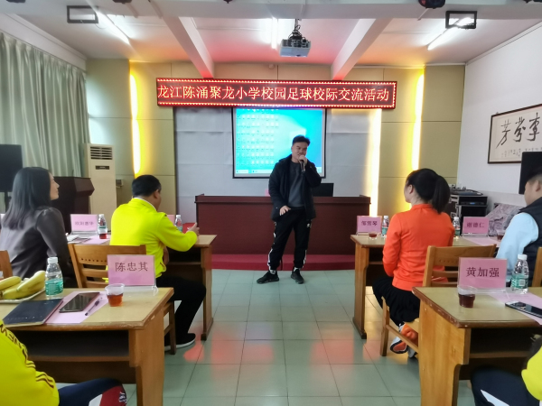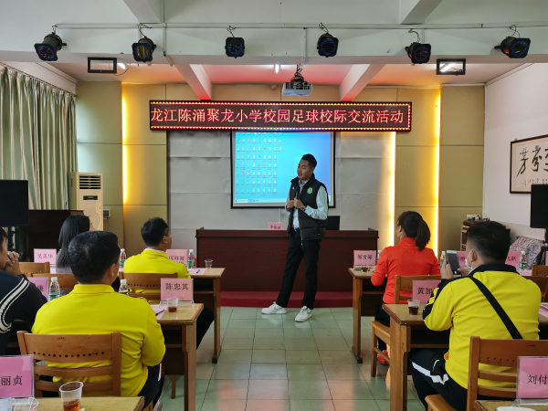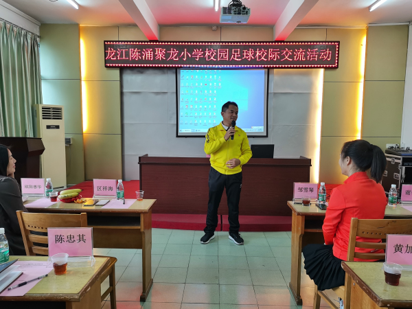 接著到交流匯報(bào)環(huán)節(jié),陳涌聚龍小學(xué)李德誠科長向來訪者介紹我校的足球特色開展情況。足球作為陳涌聚龍小學(xué)的特色教學(xué)項(xiàng)目,每學(xué)期聚龍小學(xué)堅(jiān)持選拔、培養(yǎng)優(yōu)秀足球運(yùn)動員,選送參加足球比賽都獲得優(yōu)異的成績,同時(shí)校內(nèi)還營造濃厚的足球文化,如大課間進(jìn)行足球操、每年舉辦足球嘉年華活動、班際足球賽、足球文化宣傳欄展示、班級足球黑板報(bào)評比、足球手操報(bào)評比等活動都得到了學(xué)生的喜愛和家長的支持。陳涌聚龍小學(xué)鄒雪琴校長對眾兄弟學(xué)校領(lǐng)導(dǎo)的到來表示熱烈的歡迎和感謝,她指出有眾兄弟學(xué)校的交流指導(dǎo)、經(jīng)驗(yàn)的借鑒,聚龍小學(xué)的足球項(xiàng)目會有新的突破和發(fā)展!最后,各兄弟學(xué)校展開積極的交流討論,探討如何更進(jìn)一步推進(jìn)學(xué)校特色體育項(xiàng)目的發(fā)展。