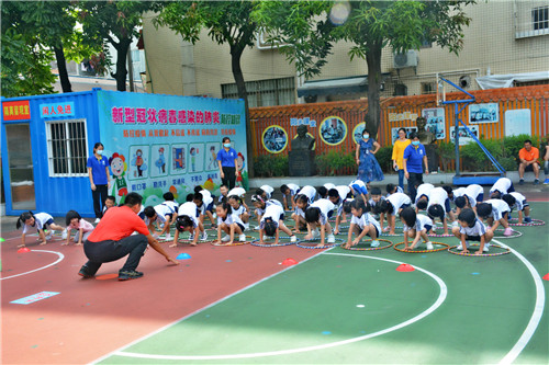 活動(dòng)第三站,學(xué)校劉志明老師帶領(lǐng)幼兒園小朋友們上了一節(jié)趣味盎然的體育課。帶領(lǐng)小朋友們做好充分地?zé)嵘頊?zhǔn)備后,劉老師根據(jù)龜兔賽跑的課程主題,學(xué)習(xí)了烏龜與兔子賽跑的姿勢(shì),融入了對(duì)應(yīng)角色,進(jìn)行賽跑活動(dòng)教學(xué)。幼兒園小朋友們各展所能,竭盡全力地奔赴終點(diǎn)。