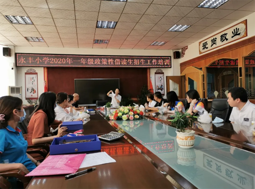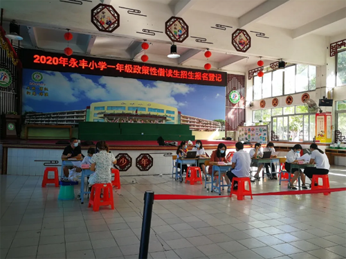 2020年6月27日,永豐小學(xué)進(jìn)行了一年級(jí)政策性借讀生報(bào)名登記。當(dāng)天早上,只見校道上整整齊齊擺放著一米間隔的紅凳子,在晨光的照射下顯得格外醒目。還沒到8點(diǎn),負(fù)責(zé)報(bào)名登記的老師就已經(jīng)來到學(xué)校,在進(jìn)行一年級(jí)政策性借讀生招生前,何主任集合大家進(jìn)行了一次招生工作前的培訓(xùn),再次提出明確的要求,此次報(bào)名工作一定要做細(xì)心耐心。