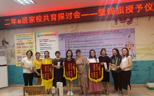二年8班家委和家長代表給何敏玲老師、廖婷老師、潘味芳老師授旗