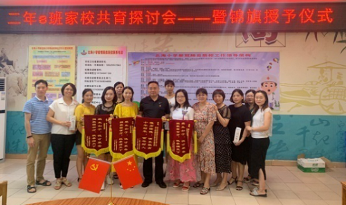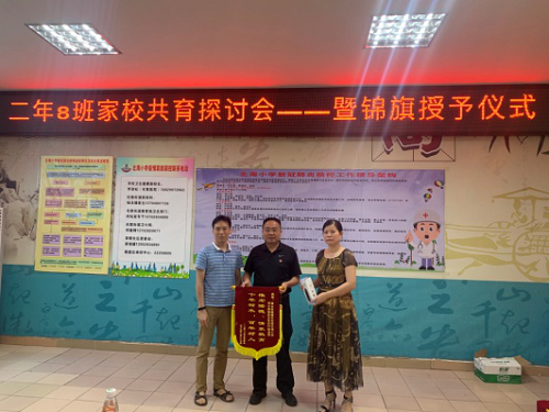 會(huì)議的最后,二年8班全體同學(xué)及家長本著誠摯的心,自發(fā)地為何小祥校長以及三位老師獻(xiàn)上感恩之旗!同時(shí),祝愿北海小學(xué)在今后會(huì)越辦越好,為祖國培育出一批批優(yōu)秀人才!