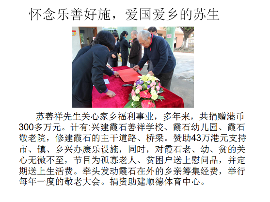 班會課上,同學(xué)們了解到善祥先生是一位樂善好施、受人尊敬的企業(yè)家,多年來一直為家鄉(xiāng)建設(shè)與教育事業(yè)作出巨大的貢獻。多年來,他共捐贈港幣300多萬元支持家鄉(xiāng)建設(shè)。為了促進家鄉(xiāng)的經(jīng)濟發(fā)展,他不僅投資250萬港元合作開辦砂磚廠,還穿針引線,引薦身旁朋友到霞石投資設(shè)廠;為了敬老尊老,他興建敬老院,并每年牽頭發(fā)動霞石在外的鄉(xiāng)親籌集經(jīng)費,舉行每年一度的敬老大會;為了發(fā)展教育,他投資興建了霞石善祥學(xué)校和霞石幼兒園,舉辦獎教獎學(xué)大會,獎勵認(rèn)真讀書的學(xué)生和勤奮的老師們,關(guān)注霞石學(xué)子的成長。這位可愛的老人對家鄉(xiāng)的感情深厚,總是想方設(shè)法地為鄉(xiāng)親們做著一件件力所能及的事情,他無私的大愛,贏得了村民對他的敬佩和贊頌。