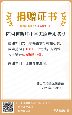 “99公益日”活動時間為每年9月7日-9月9日,在這三天時間里,新圩小學(xué)家長志愿者服務(wù)隊積極響應(yīng)陳村慈善會暖心餐項目,在“99公益日平臺”的捐助倡議,致力為陳村鎮(zhèn)困難長者、殘疾人解決買菜難、煮飯難的問題、帶去生活便利、減輕經(jīng)濟負擔(dān)。