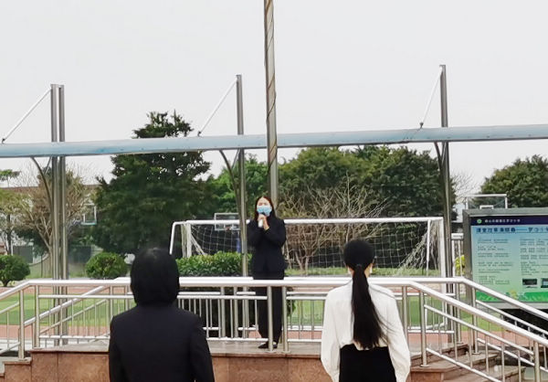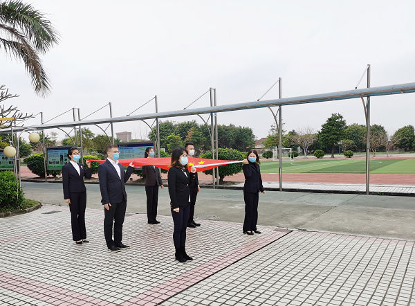 空曠的操場上,莊重如常。張永新校長和行政團(tuán)隊分別擔(dān)任本次儀式的升旗手和護(hù)旗手,步伐整齊劃一。
