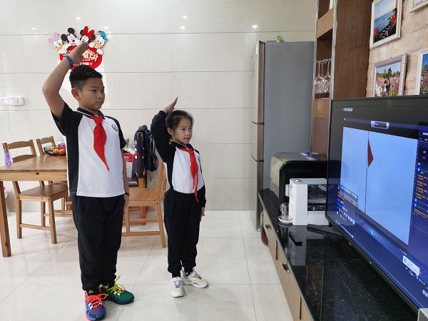 伴隨著雄渾激昂的國歌,鮮艷的五星紅旗在羅沙校園冉冉升起。升旗臺前,老師們衣著端莊,隊列整齊;電腦、手機(jī)屏幕前,師生、家長們神情莊嚴(yán)肅穆,行禮,全體同時齊唱國歌。