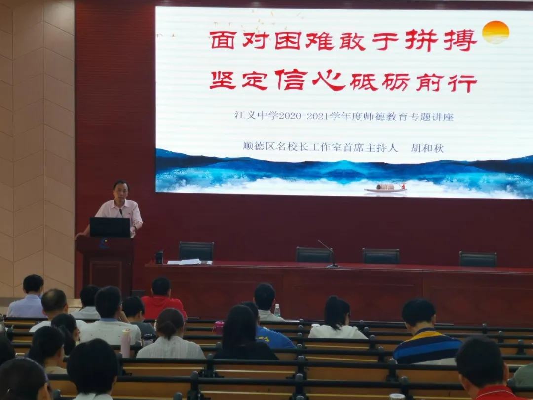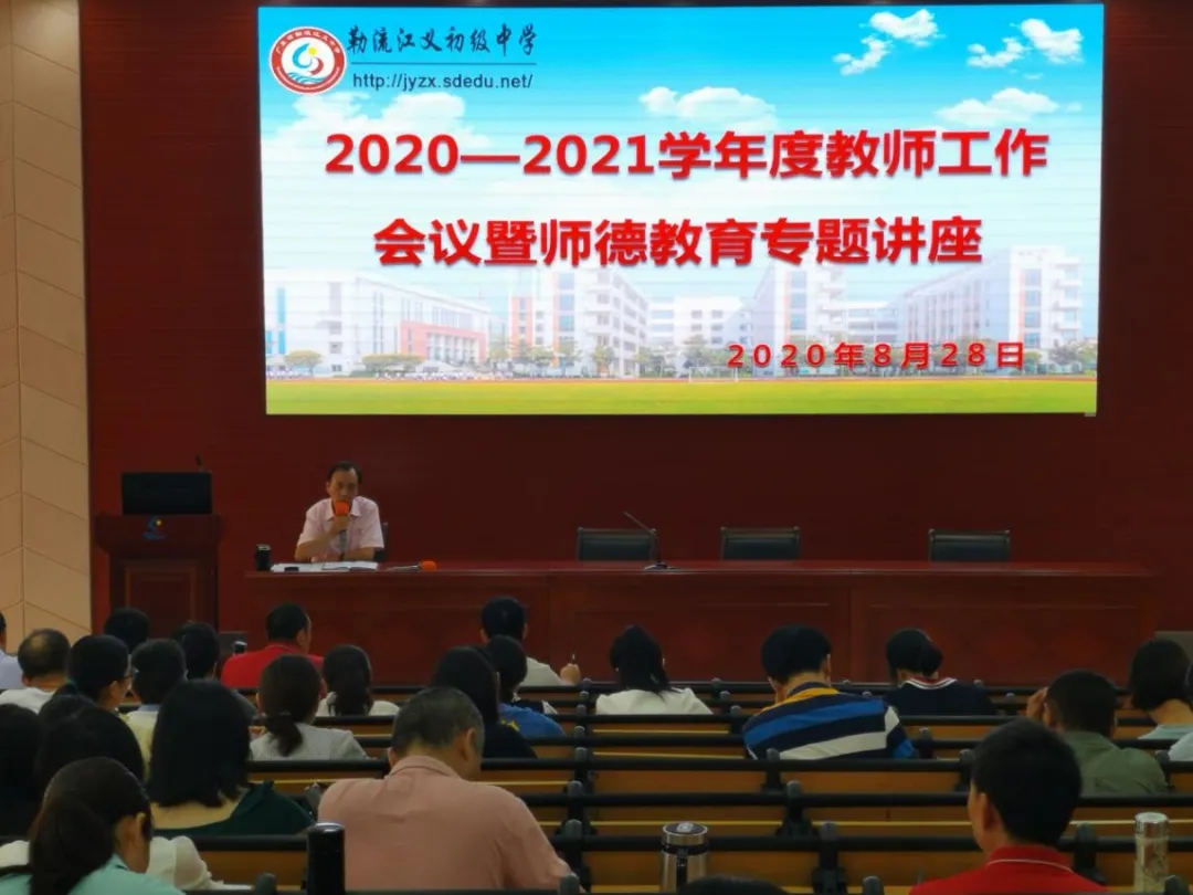 2020年8月28日,江義中學(xué)2020―2021學(xué)年度教師工作會議暨師德教育專題講座在學(xué)校曉理廳召開。學(xué)校黨總支書記、校長胡和秋以“面對困難敢于拼搏,堅定信心砥礪前行”為主題,對學(xué)校新學(xué)期工作進行部署和開展師德教育專題講座。