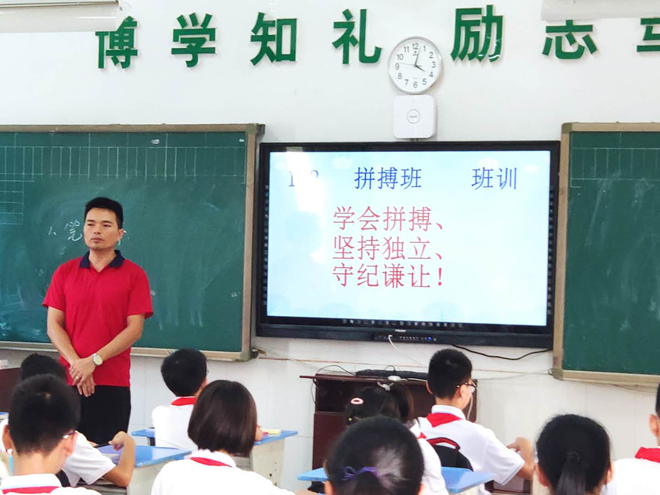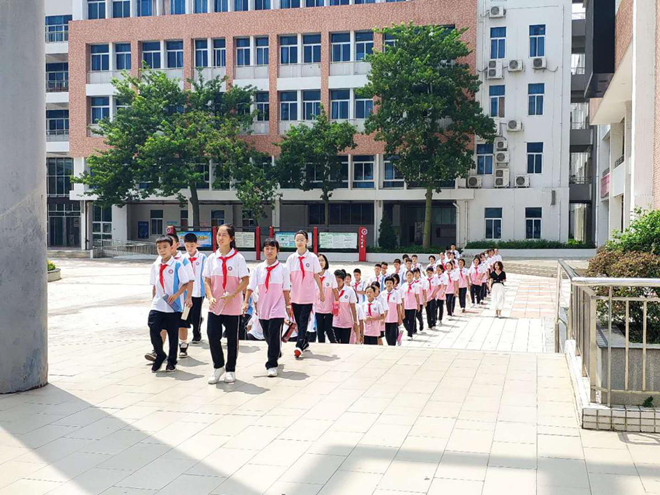 (初二的班長帶領(lǐng)各班“傳經(jīng)送寶”,參觀校園)