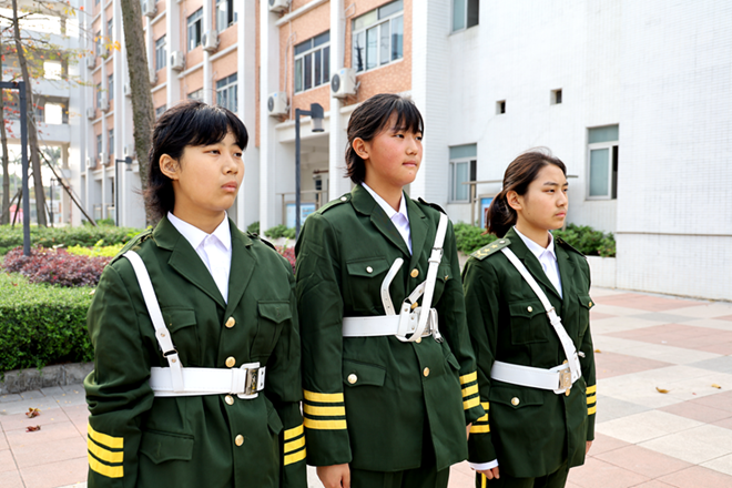 升旗儀式上,全體師生奏唱國歌,行莊嚴(yán)的注目禮。