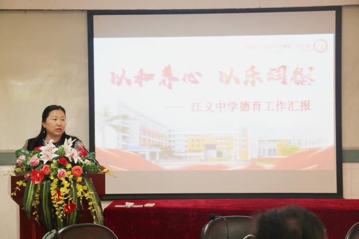 江義中學德育代表圍繞學校管理機制、心育工作、德育課程、創(chuàng)新工作四個方面作了《以和養(yǎng)心,以樂闊德》主題分享,學校德育工作通過學校章程的規(guī)范引領,和樂課程的有序開展,三全育人的深入人心,評價機制的成熟高效,在品牌特色中不斷彰顯成效,推動江中和樂文化發(fā)展。