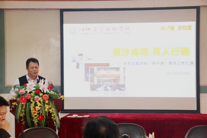 我校盧林副校長以《聚沙成塔,育人行德》為主題分別從“育人行德金字塔”體系的一個理念、二個目標、三支隊伍、四個維度、五大內容、六種途徑六個方面作學校德育工作匯報。學校緊緊圍繞“育人行德,知書達賢”的辦學理念,以“辦教師樂教、學生喜愛、家長滿意、社會信任的優(yōu)質高端民辦學?!睘槟繕耍瑘猿炙刭|教育,以高品質定位、精細化管理、多元化發(fā)展。德育隊伍建設和文化建設,夯實常規(guī)管理,致力改革創(chuàng)新,探索“五四學制”管理新模式,以愛為主線,貫穿九年義務教育,培養(yǎng)三觀端正、情感健全的新時代建設者與接班人,形成了自主管理特色,鑄造了誠信教育品牌,使優(yōu)良校風保持高位發(fā)展。