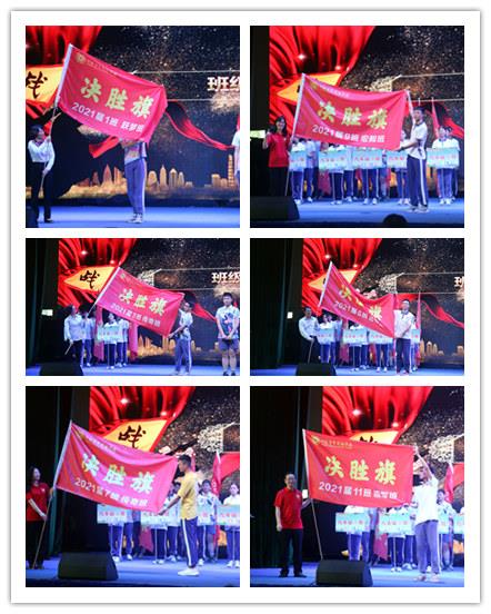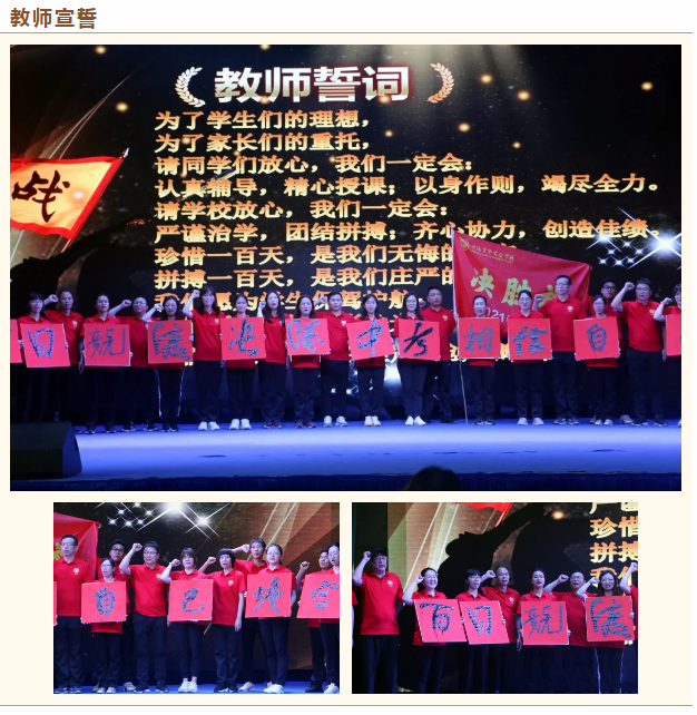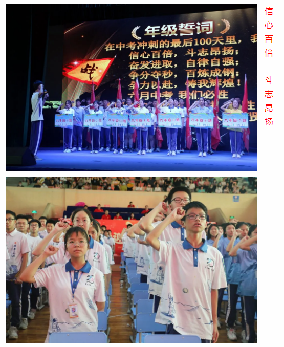 在陣陣加油聲中,濮校長(zhǎng)上臺(tái)為九年級(jí)教師團(tuán)隊(duì)頒發(fā)“決勝旗”,麥景志主任帶領(lǐng)全體九年級(jí)教師宣誓,老師們的誓詞鏗鏘有力,充滿了必勝的決心。